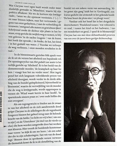 Blij met de recensie van mijn bundel ‘Het geduld van water’ door Jooris van Hulle in de laatste Poëziekrant. In zijn inleidende alinea merkt hij op dat de suggestieve kracht van het schilderij op de cover ook de gedichten in de bundel kleurt en hij sluit af met: “Clarysse ons laat met deze debuutbundel proeven van een over de jaren heen gerijpt dichterschap”.